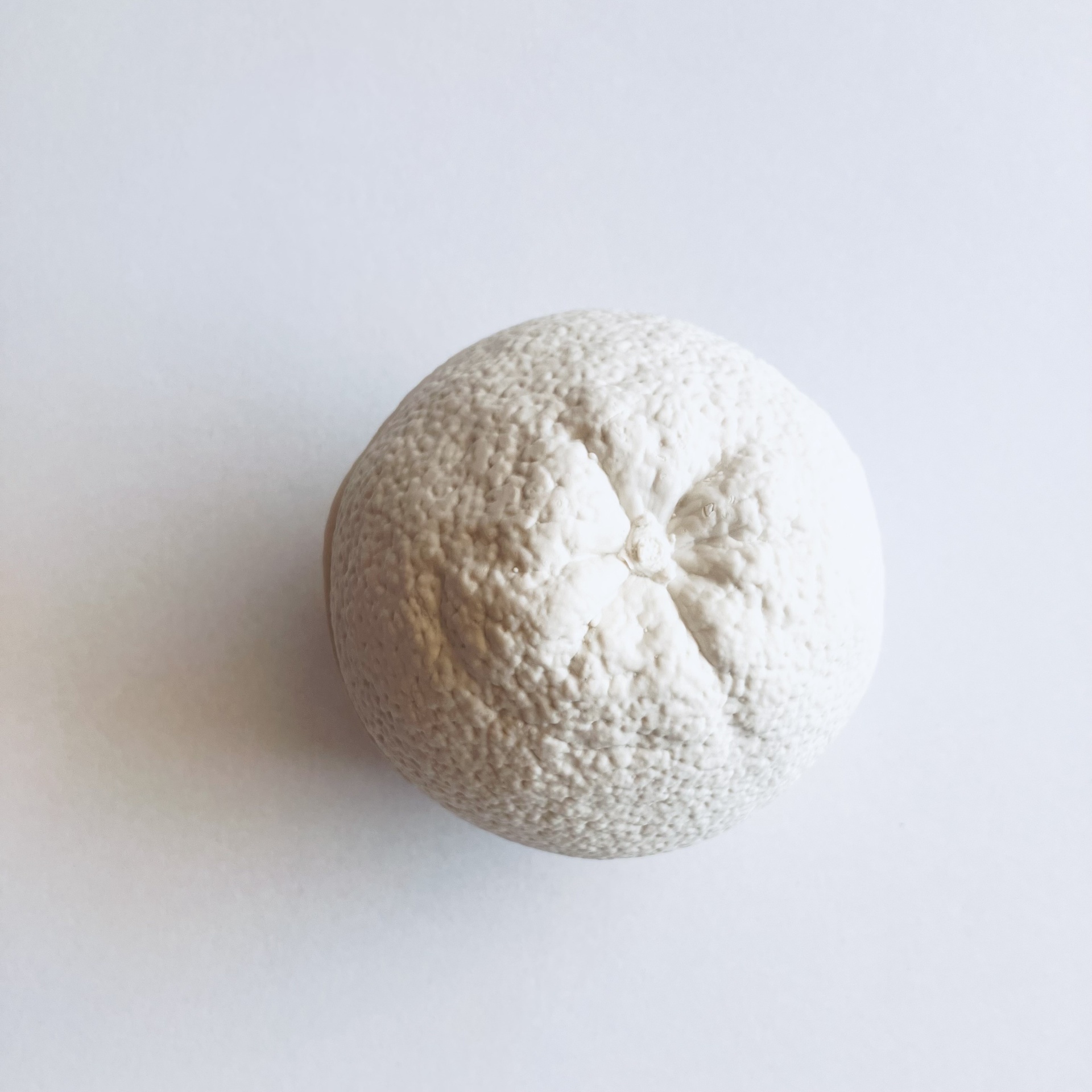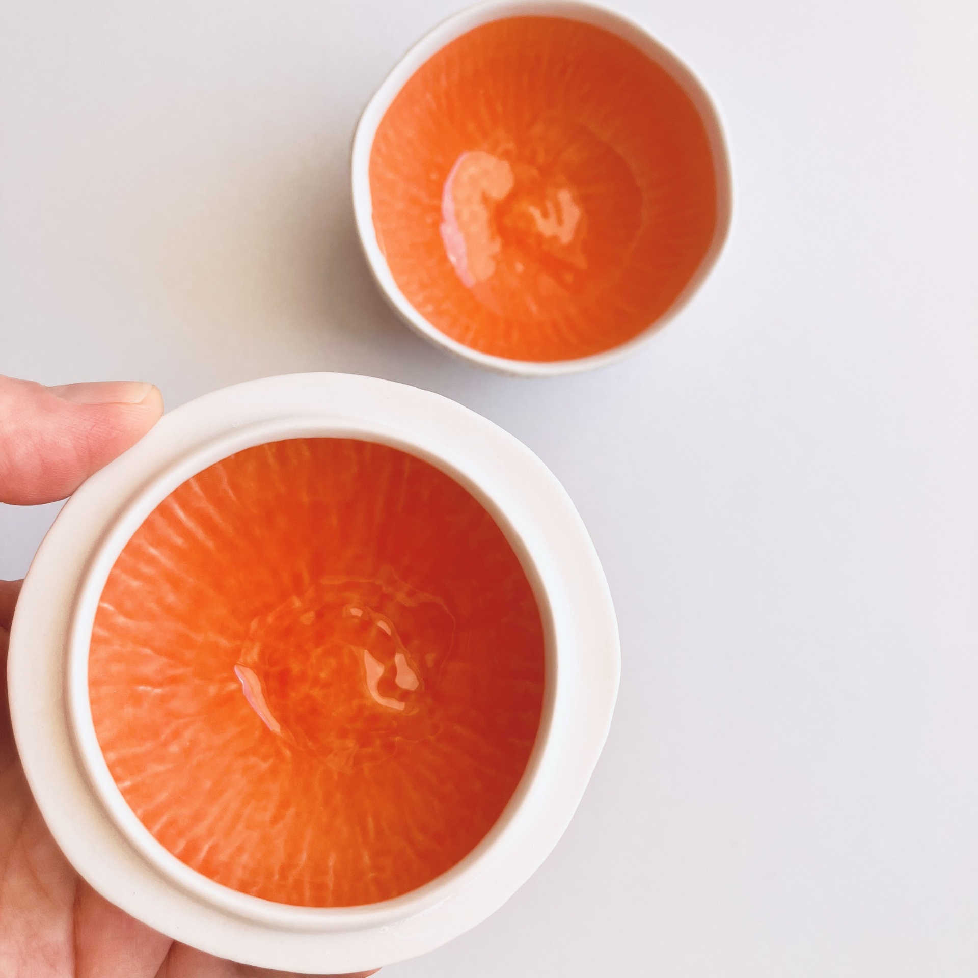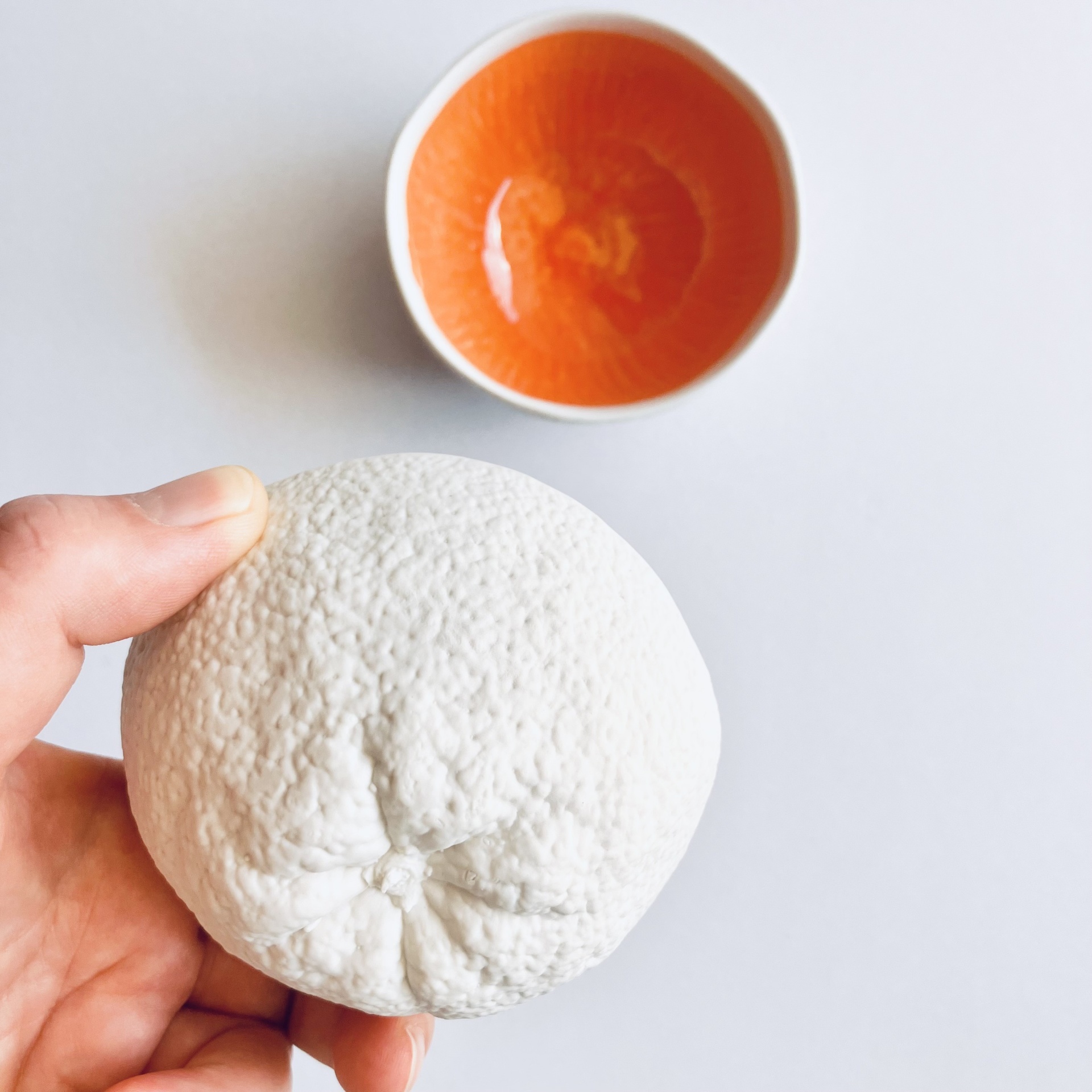 Fruto Laranja, laranja no interior, fechado, é uma caixa para guardar surpresas, quando aberto torna-se em 2 taças individuais.