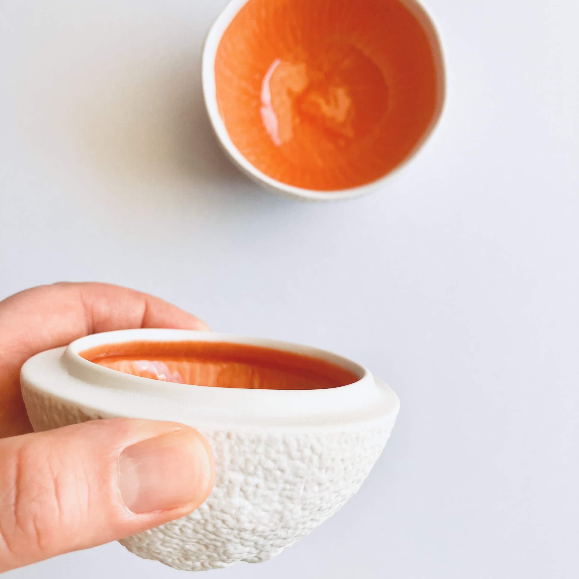 All pieces are produced manually with slip cast limoges porcelain. In the finish, they are sanded/polished and glazed by hand, there may be slight variations in the texture and color inside the pieces, making them unique.