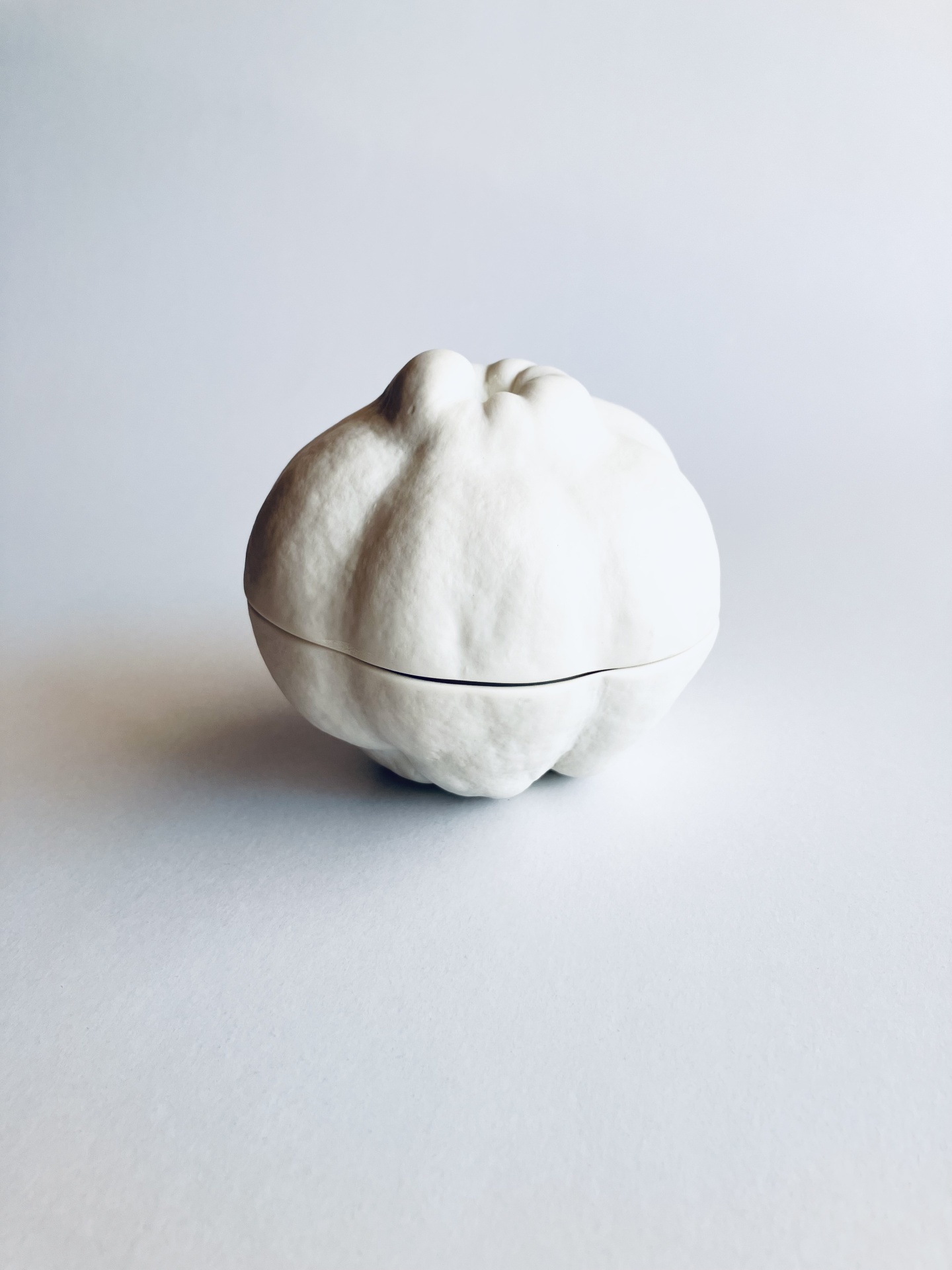 Marmelo Surpresa, amarelo no interior, fechado, é uma caixa para guardar surpresas, quando aberto torna-se em 2 taças individuais.