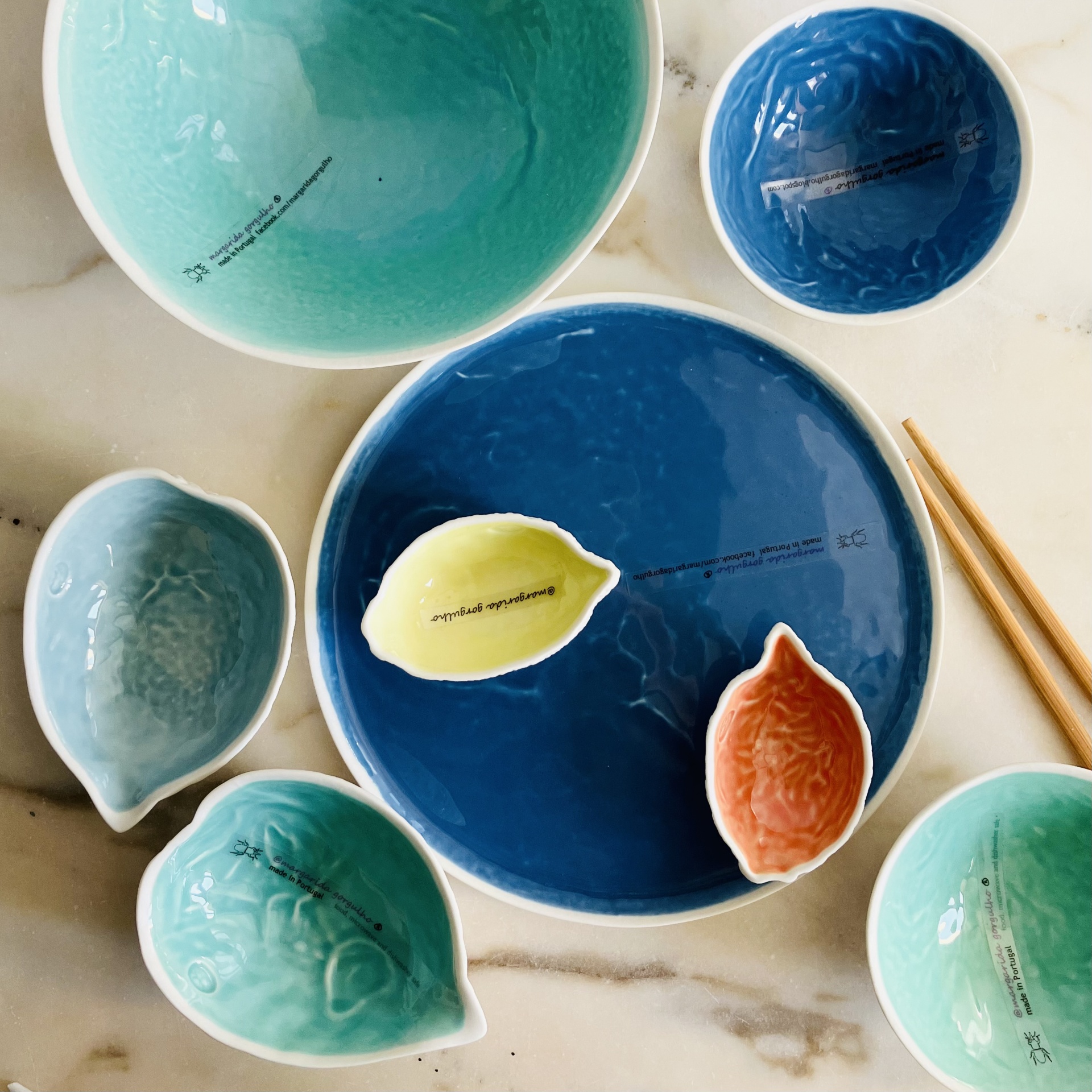Decorated with colourful glazed inside. The exterior is without glaze, thus making use of porcelain properties: delicacy, strenght, translucency, impermeability. All pieces are produced manually with slip cast limoges porcelain. In the finish, they are sanded/polished and glazed by hand, there may be slight variations in the texture and color inside the pieces, making them unique.