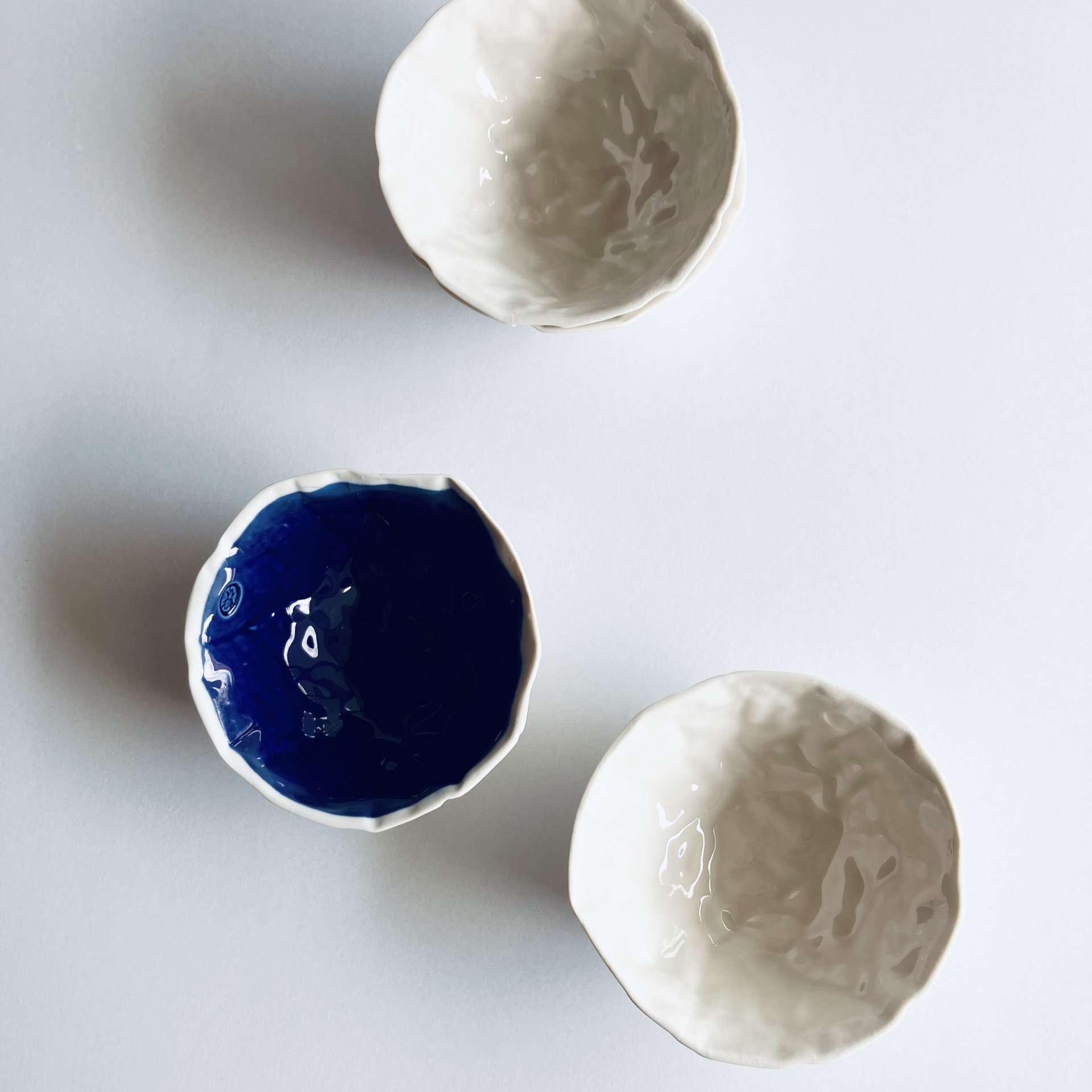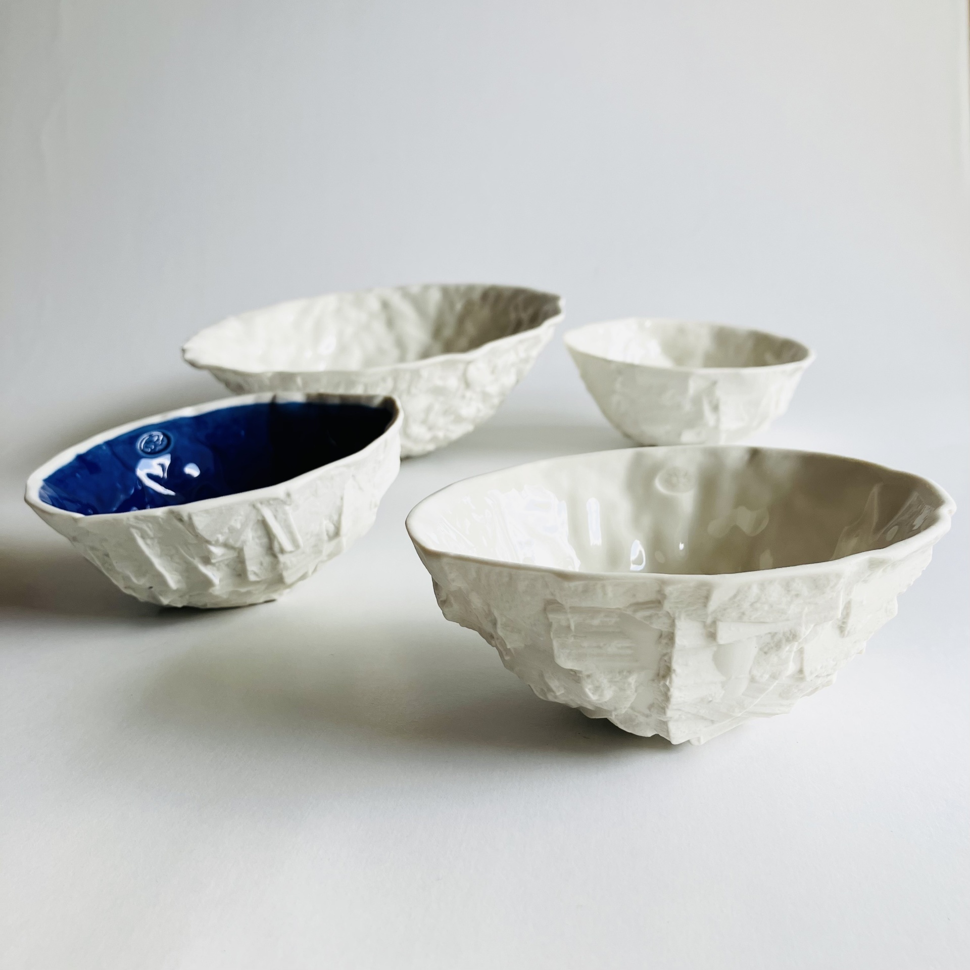 All pieces are produced manually with slip cast limoges porcelain. In the finish, they are sanded/polished and glazed by hand, there may be slight variations in the texture and